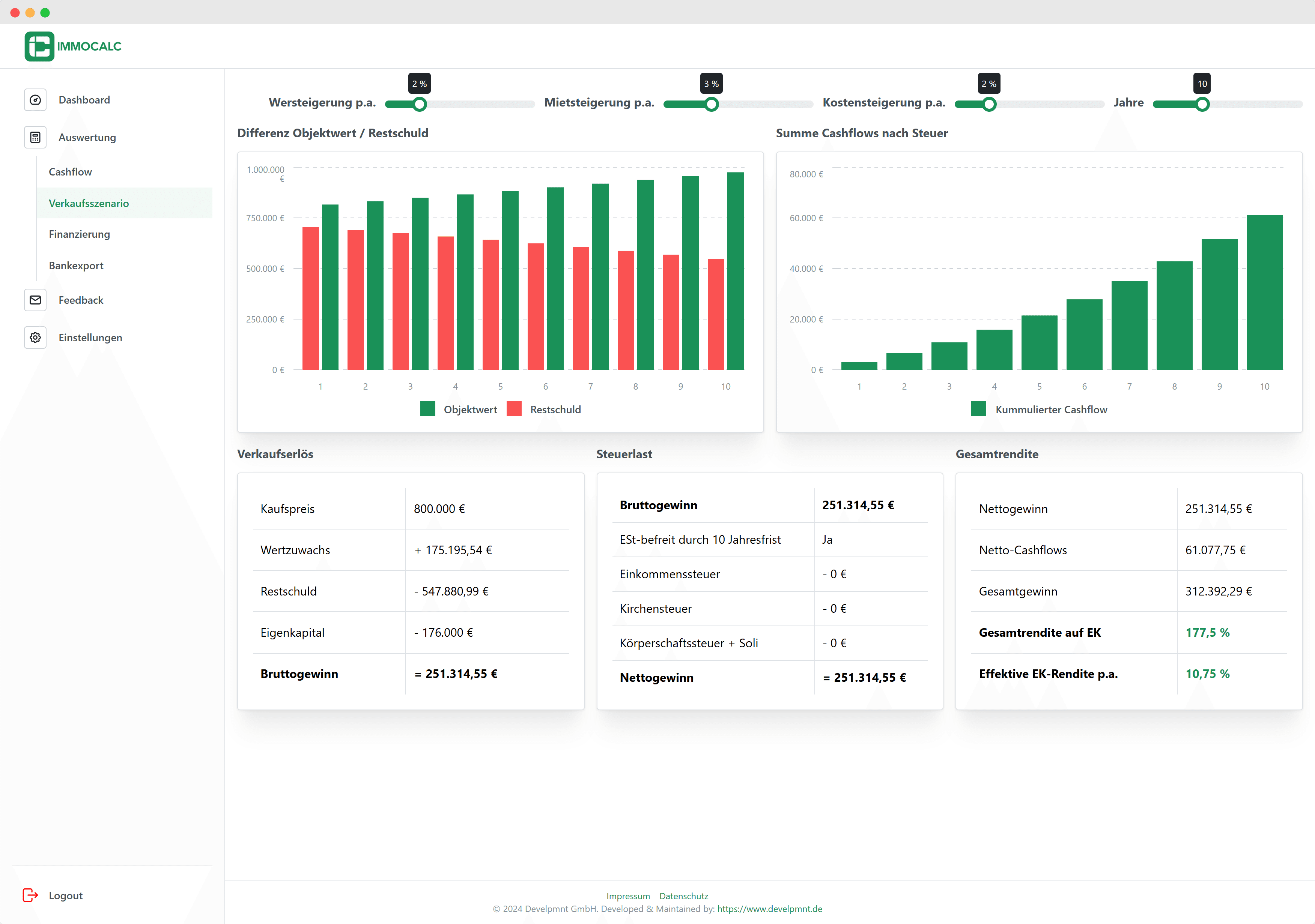 Ich hab viele Berechnungstools hinter mir. Häufig wurde die Eigenkapitalrendite undurchsichtig oder viel zu hoch berechnet. Ich finde das Verkaufsszenario in der Auswertung mega, weil es eine realistische Abbildung eines Vermietungs inkl. Verkaufsprozesses abbildet.